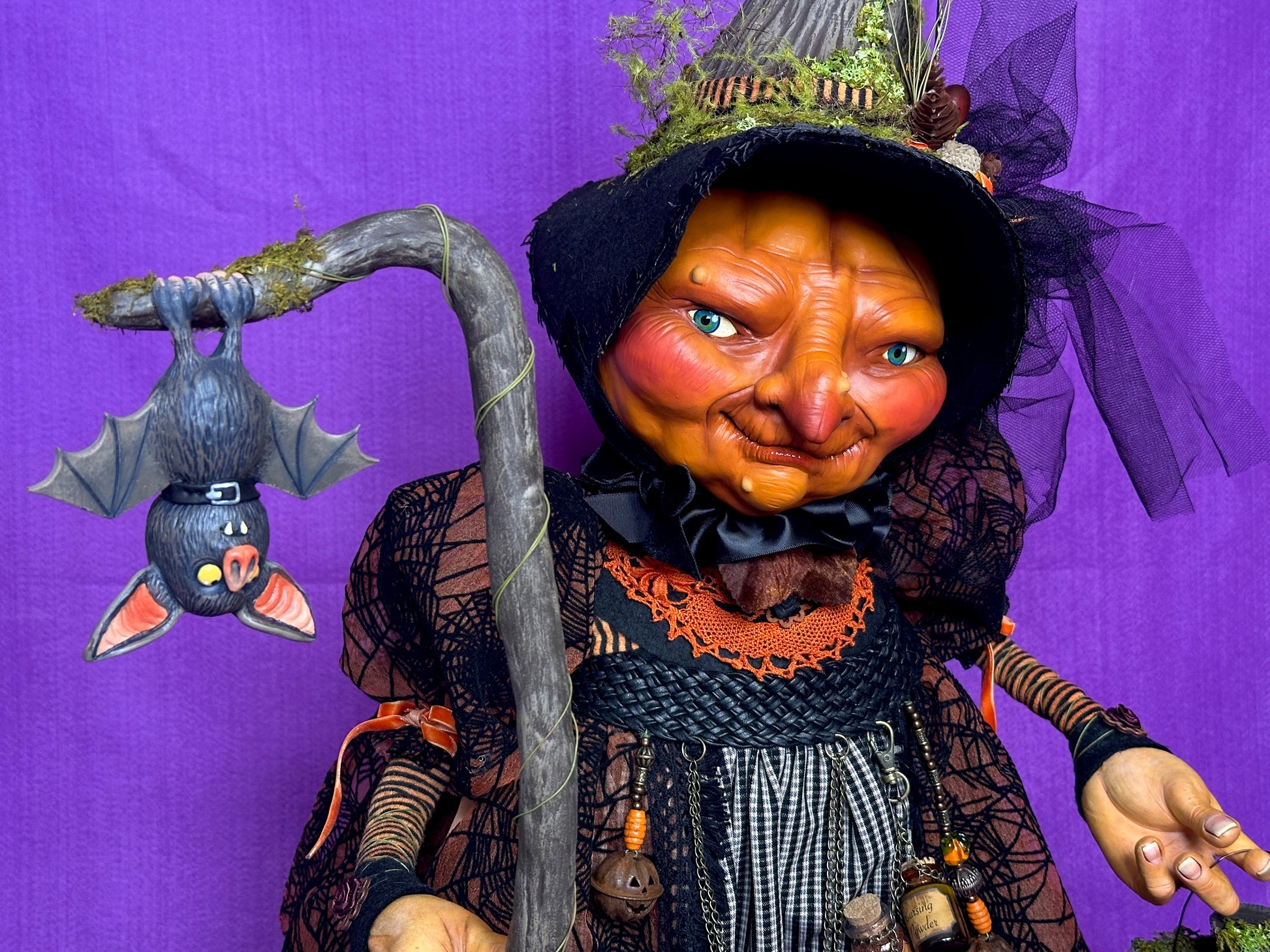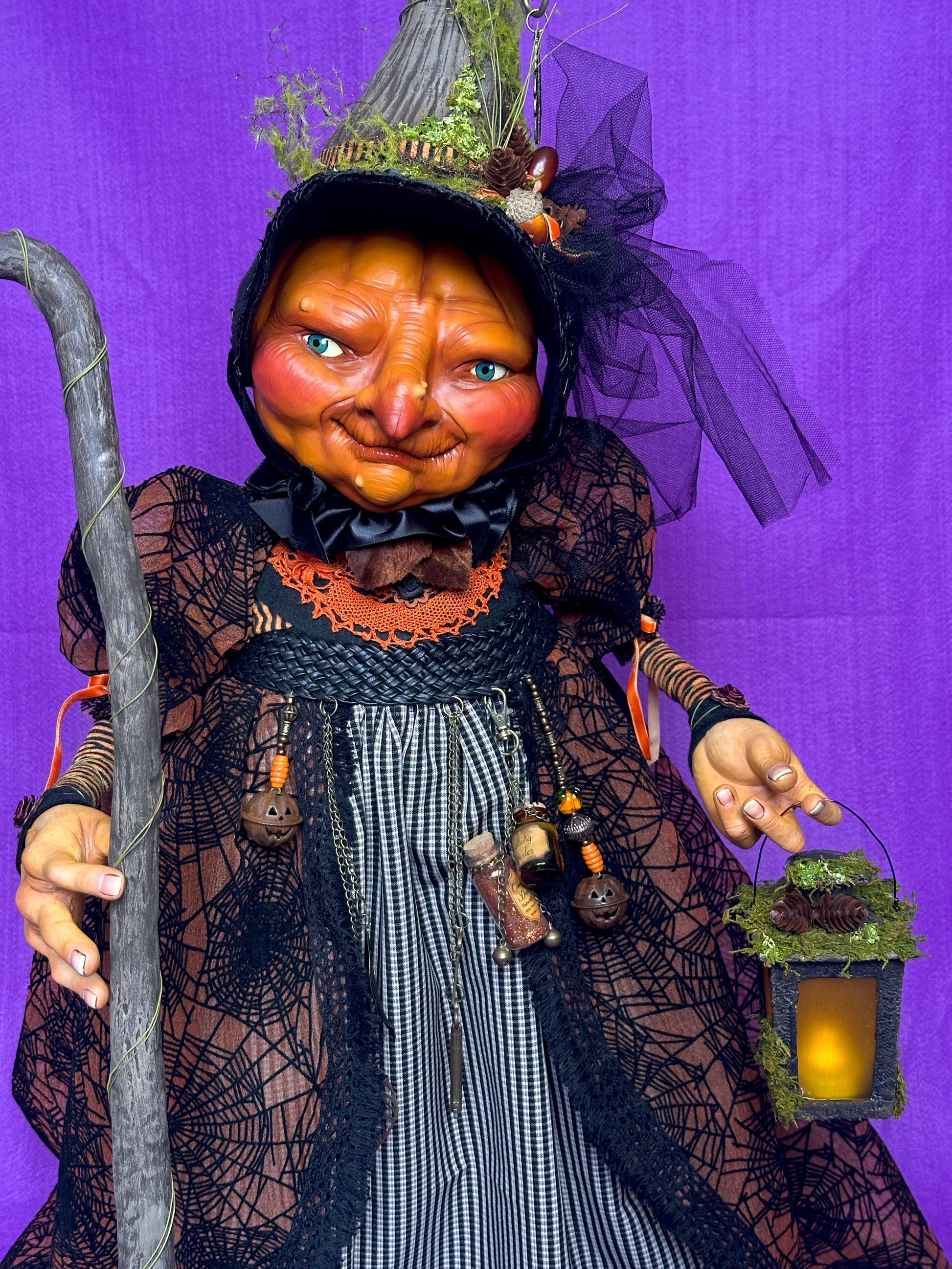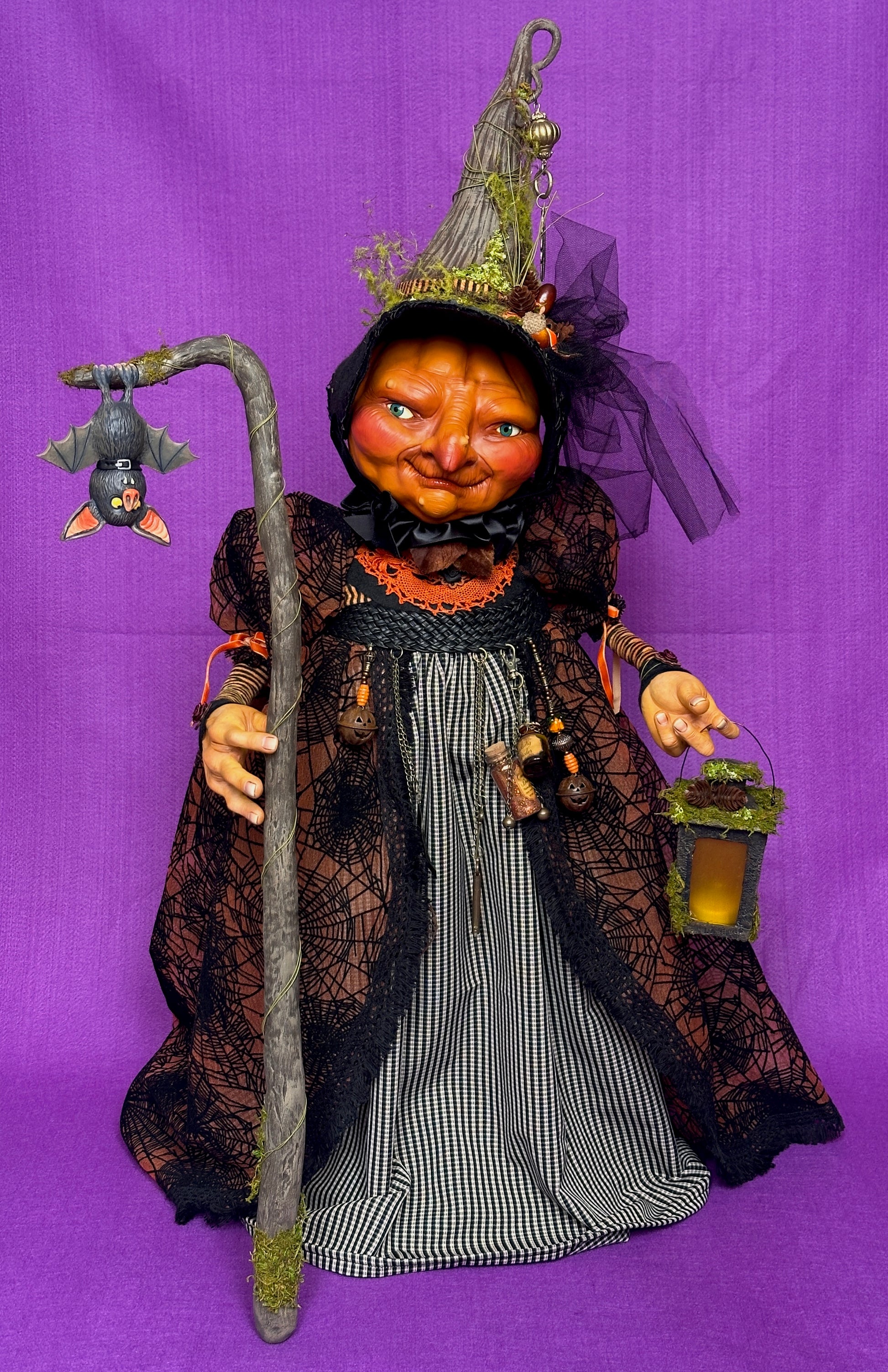 Gretchen is a village witch who so loves Halloween that she is slowly transforming into a pumpkin. She wanders her village streets on Halloween night, accompanied by her familiar, Myskia, checking on revellers and making sure that no spoilsports are handing out ‘healthy treats’ to children. Gretchen is sculpted with polymer clay on a wire and fabric armature, and hand painted with acrylic paint. She is costumes in various fabrics and findings and carries a lantern which lights up. Muskie (the bat) is sculpted from polymer clay and her staff/perch is sculpted from foam clay. 85cms high.