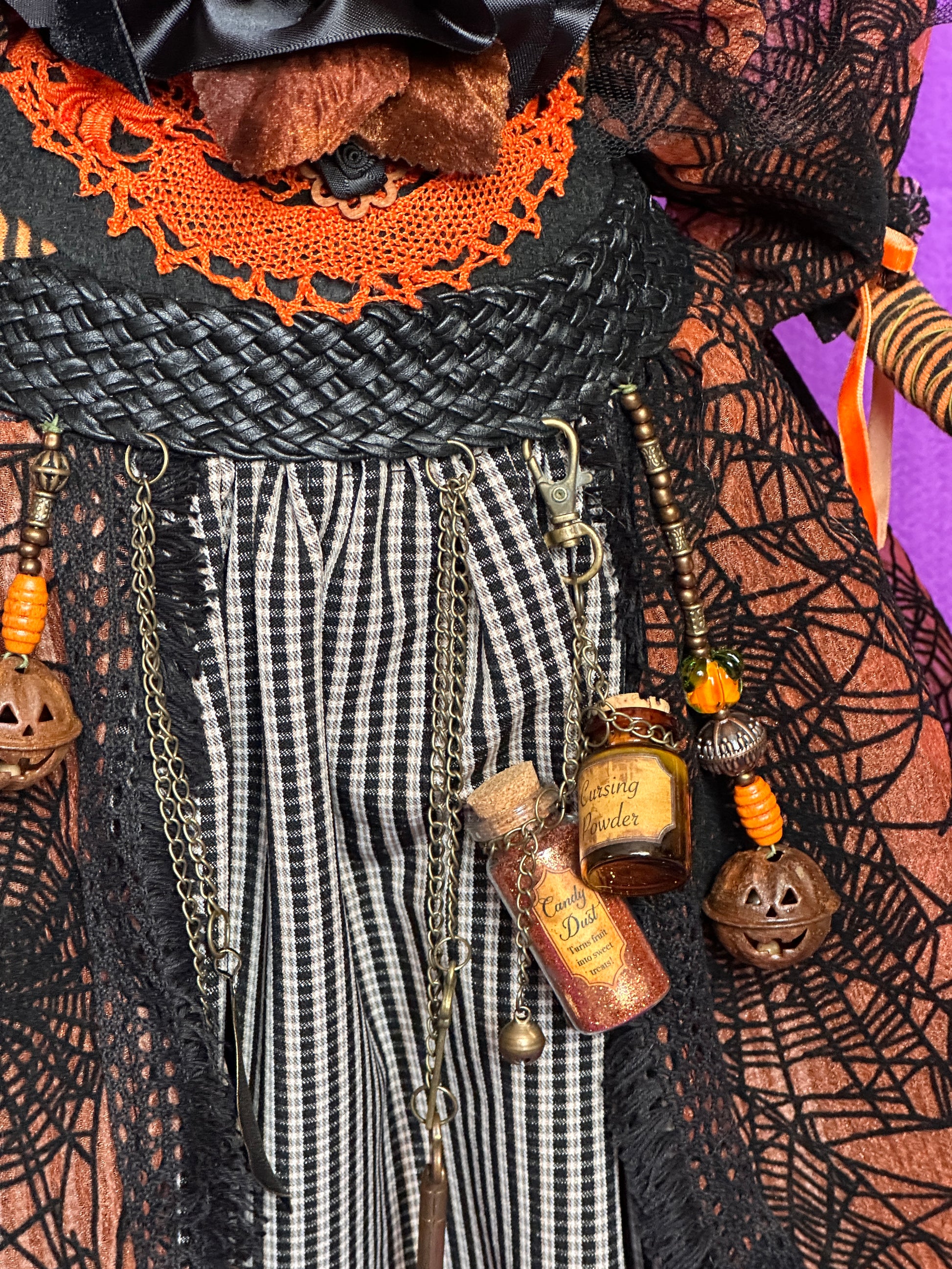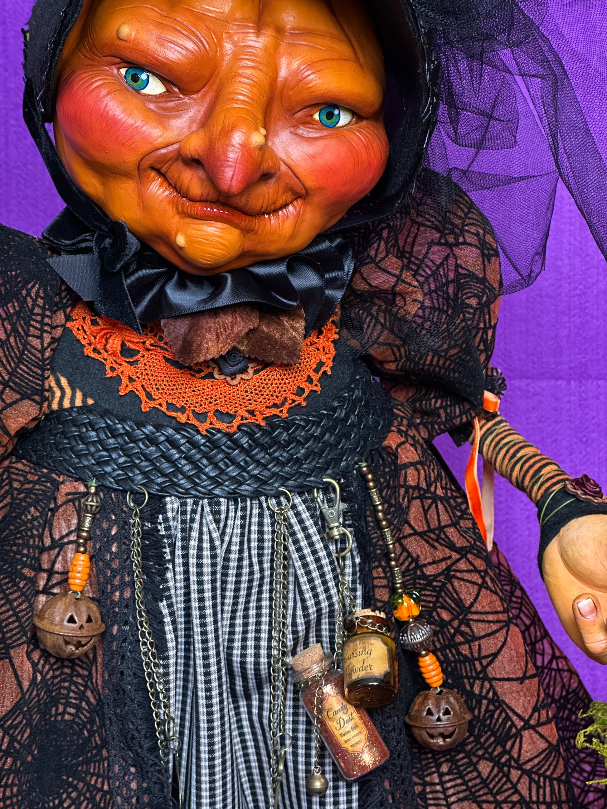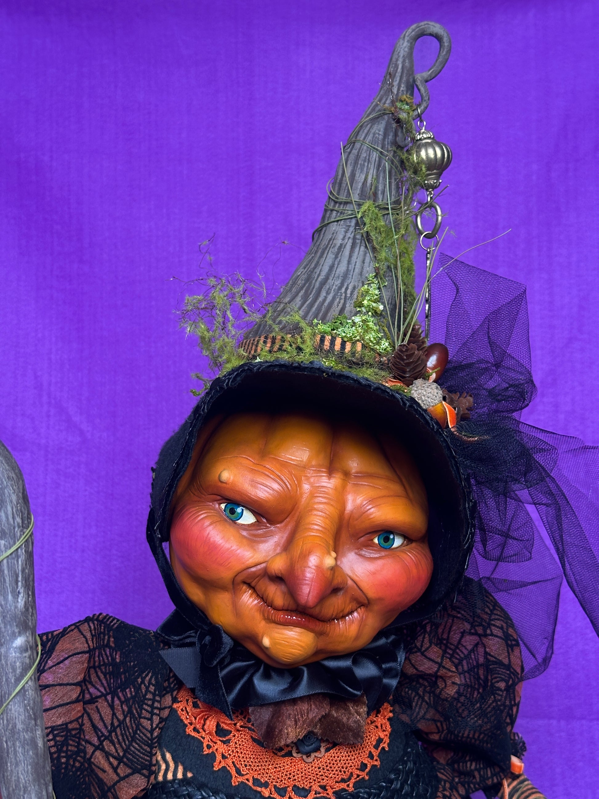 Gretchen is a village witch who so loves Halloween that she is slowly transforming into a pumpkin. She wanders her village streets on Halloween night, accompanied by her familiar, Myskia, checking on revellers and making sure that no spoilsports are handing out ‘healthy treats’ to children. Gretchen is sculpted with polymer clay on a wire and fabric armature, and hand painted with acrylic paint. She is costumes in various fabrics and findings and carries a lantern which lights up. Muskie (the bat) is sculpted from polymer clay and her staff/perch is sculpted from foam clay. 85cms high.