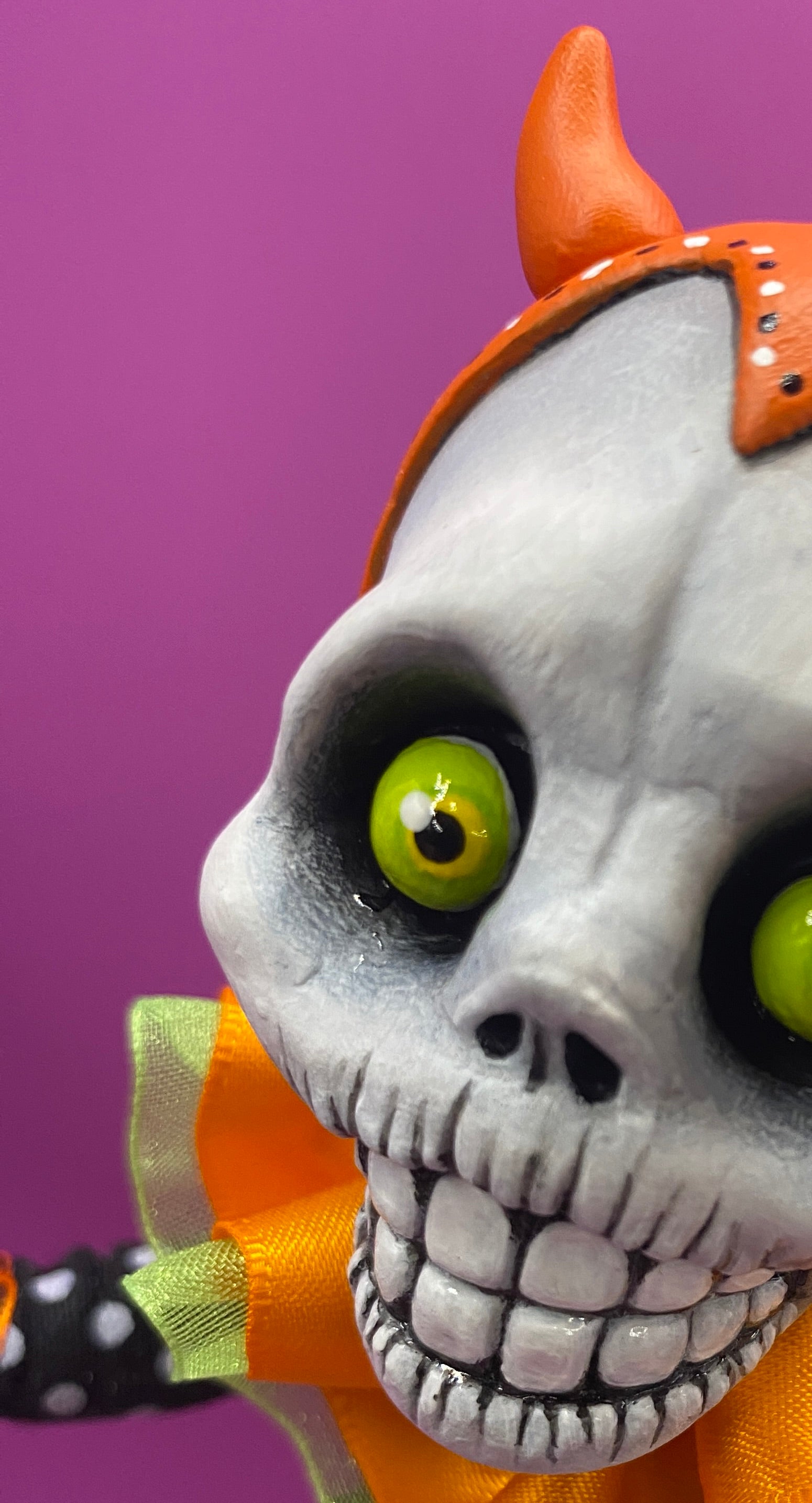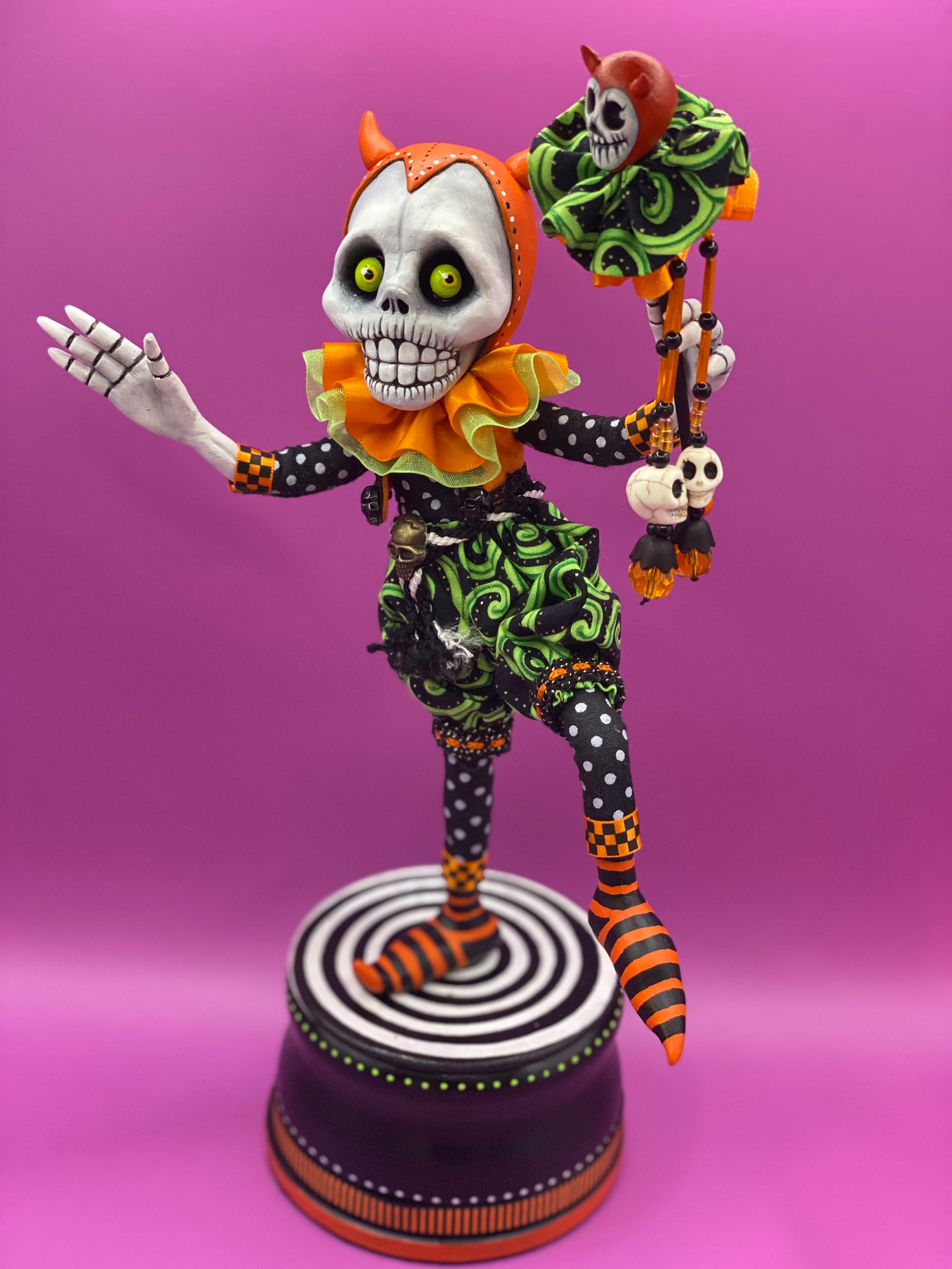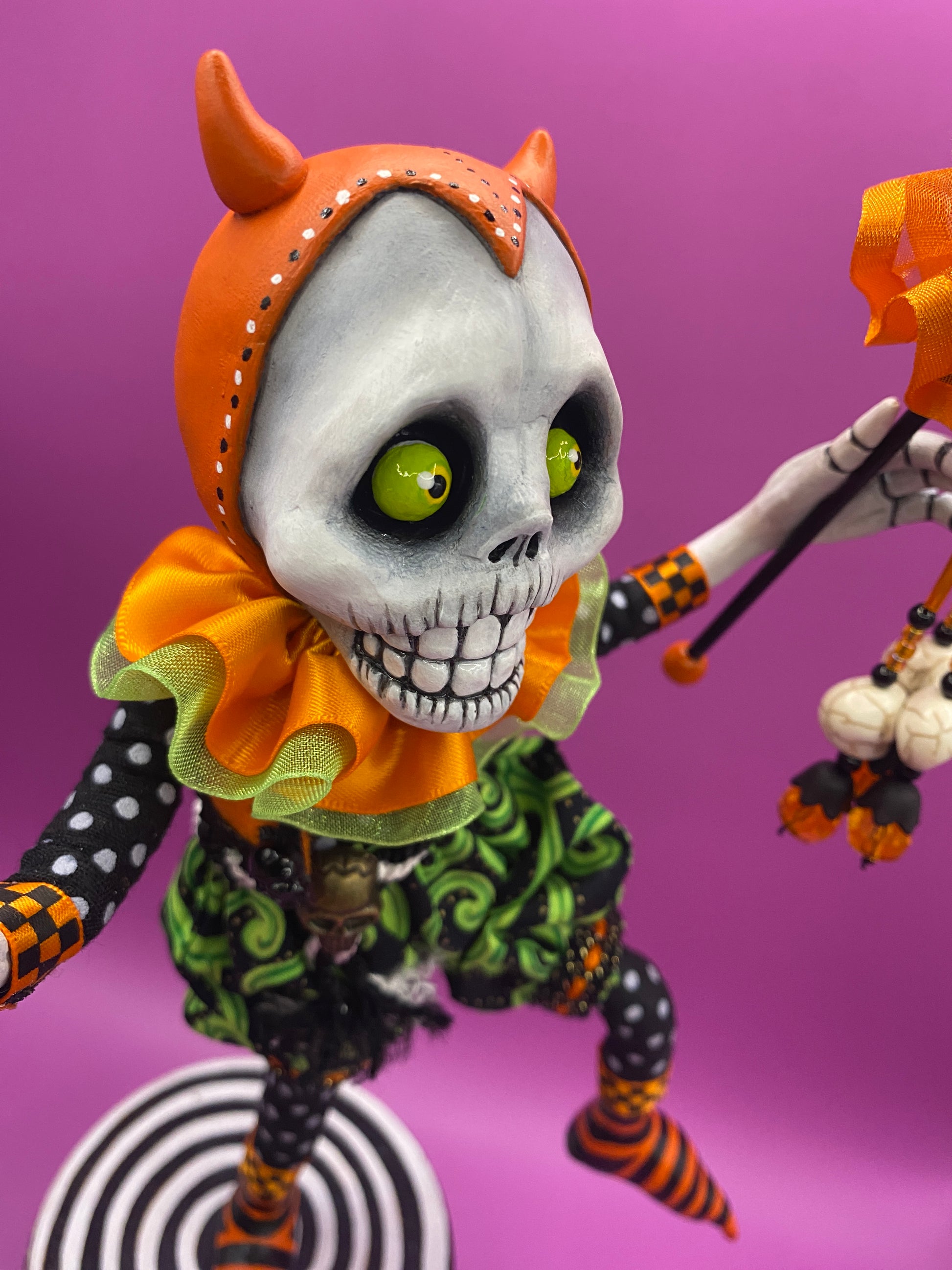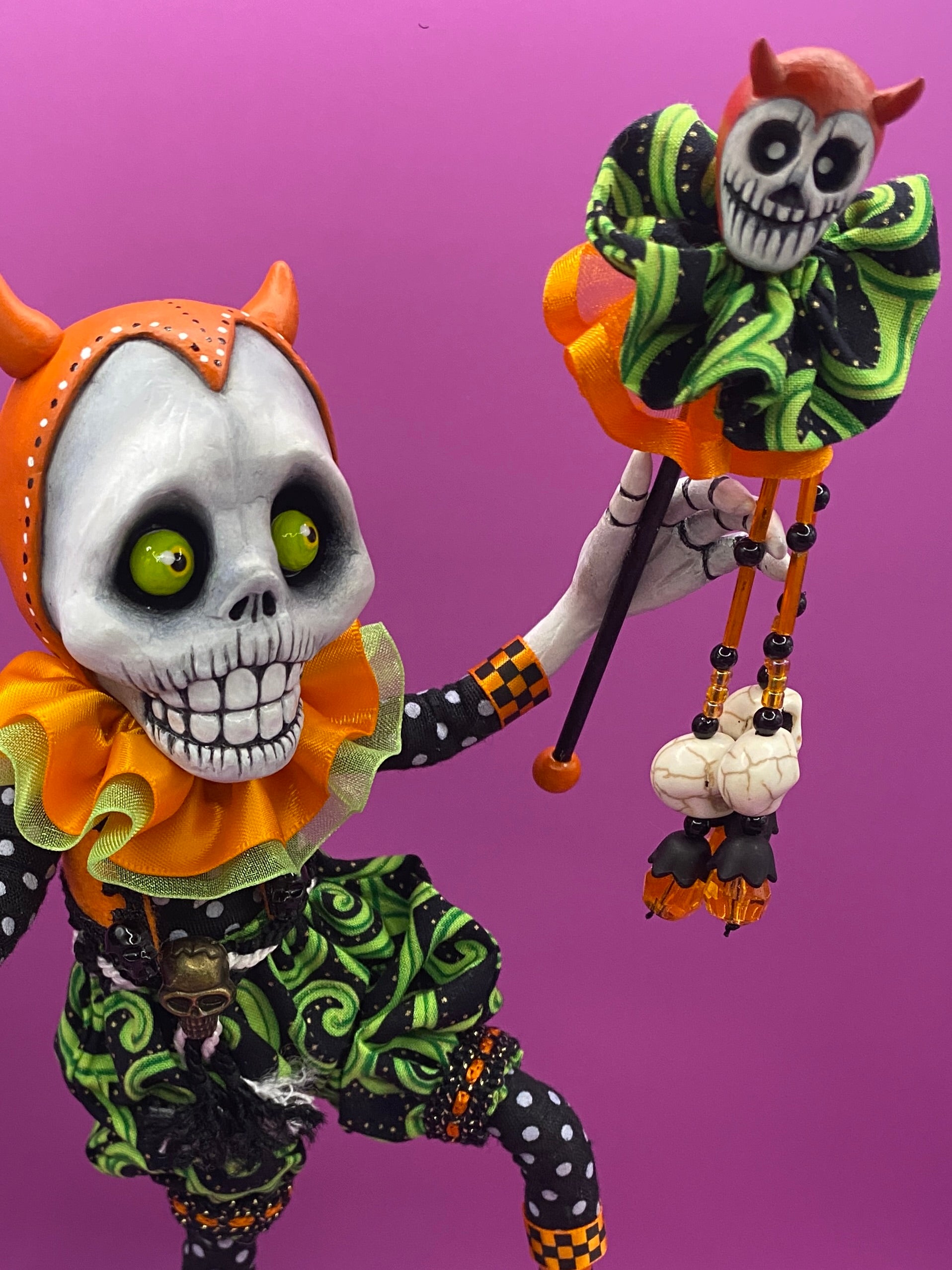 Jasper just loves Halloween and pulls out all the stops to celebrate his favourite day. He is sculpted with polymer clay on a wire and fabric armature and is hand painted with acrylic paint. He holds a miniature skull jester and is embellished with a variety of textiles and findings. 20cms high.